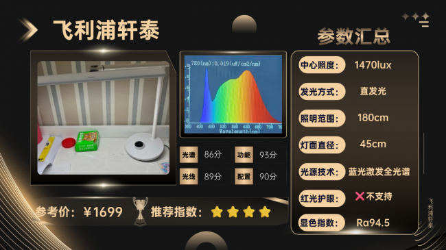核心光源方面,采用的是全光谱光源,整体来看各个波段的过渡比较顺畅自然,光谱连续性较好,只不过它的蓝光达到了1.0的峰值,在蓝光控制上属于中等偏下的水平。光源上它独特的T型光源结构配合弧面灯头,发光面直径约43cm,采用侧发光方式,光线分布相对均匀,照明覆盖面可达1.4米左右,对于大书桌和双人桌来说友好。同时中心照度也达到了930lux,符合国AA级照度标准,也支持3000K-5000K色温调节和智能调光等。