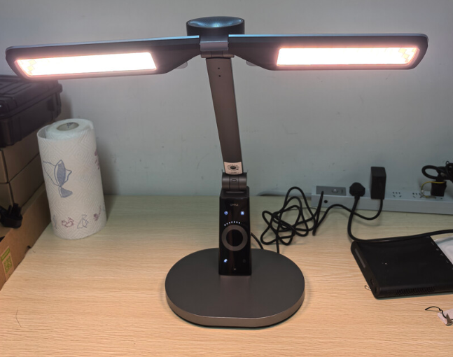 核心光源方面,采用全光谱灯珠,蓝光含量符合RG0标准,同时绿光到红光波段完整,光线舒适度比较均衡,光谱表现还可以。但在光线上会存在一点问题,它配备58cm长条形灯头,采用上下立体双光源结构,主灯提供基础照明,上方辅助光源负责漫射补光,在这种设计下,整体照明覆盖可达约1.4米,中心照度超过1600lux,亮度储备比较充足。同时它还支持智能感光和三档色温切换,能够根据环境光线自动调节亮度。不过,由于它直发光和较高照度的特性,在光滑桌面上可能会出现局部眩光。