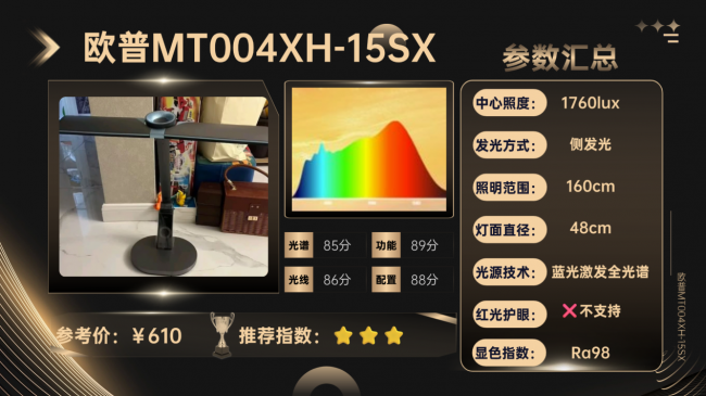 在光线方面,欧普MT004XH-15SX采用侧发光结合48cm双翼光源面设计,两侧光源可进行大幅度旋转,能减少光线直射眼睛的概率,光线柔和度适中,同时由于可以多角度旋转,所以它的光线可以覆盖约160cm的桌面,满足了大尺寸书桌照明需求。避免亮度集中或刺眼。光效方面,它的显色指数达到了Ra98,色彩还原真实,同时色温可在3100K-5100K之间无极调节,配合多档亮度与场景模式切换,满足不同场景的需求。