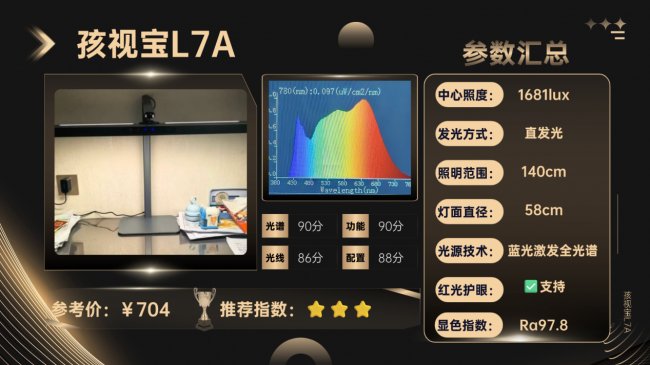 6、孩视宝L7A品牌定位:孩视宝是专注于护眼照明领域的品牌,主打贴合学生群体的照明产品,深耕家用护眼场景多年,L7A面向有学生的普通家庭,主打宽敞照明范围与高亮度照明,适配学生日常读写使用,外观简约、适配多种家居风格。