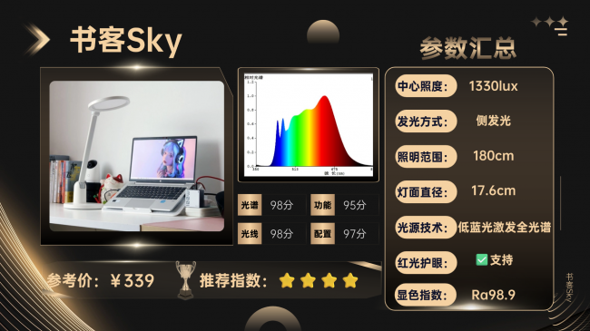 在百元价位段,书客Sky实现了出色的护眼性能。其采用全光谱光源并将有害蓝光峰值控制在0.6,同时结合RRT2.0红光技术补充有益波段,能有效缓解视觉疲劳。此外,其核心搭载5域环控光学系统与DT多维漫射2.0技术,通过精密导光结构实现93%的光线柔和度提升,有效消除颗粒感与光斑,视觉舒适度好。在功能方面则支持多模式切换与定时提醒,灯头可大角度调节,圆润机身设计兼顾安全性,是预算有限但不愿在核心护眼性能上妥协家庭的理想选择。