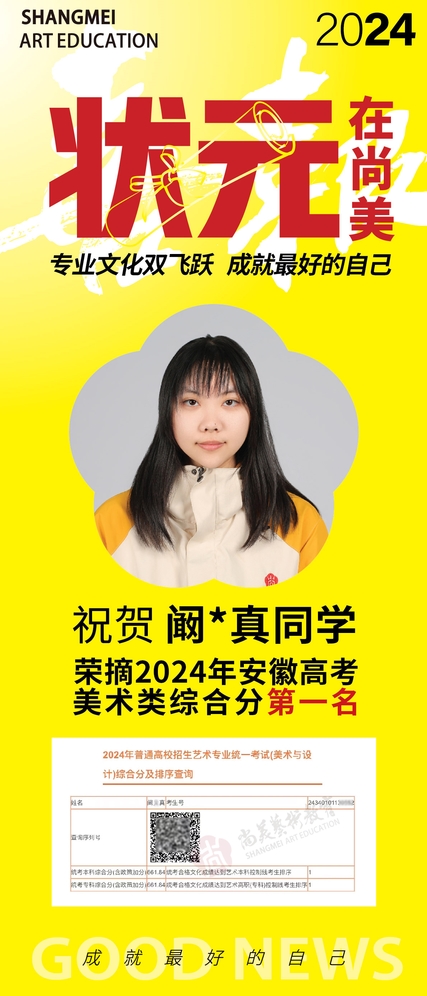 高考是一场人生际遇,也是成长过程中的刻骨记忆。2024年高考落下帷幕后,各地区的高考状元也随即出炉,优秀学子们在高考成绩公布的那一刻,收获了久违的成长和幸福。来自合肥尚美艺术学校的阚*真同学不负众望,考场折桂,成为2024年安徽省高考美术类状元,同时阚同学在此前清华校考中也拿到了全国18名的佳绩。阚*真同学表示:学校的教育理念与教育模式在她的心里留下了深刻的印象,也成为她未来发展道路上难能可贵的“经验”。