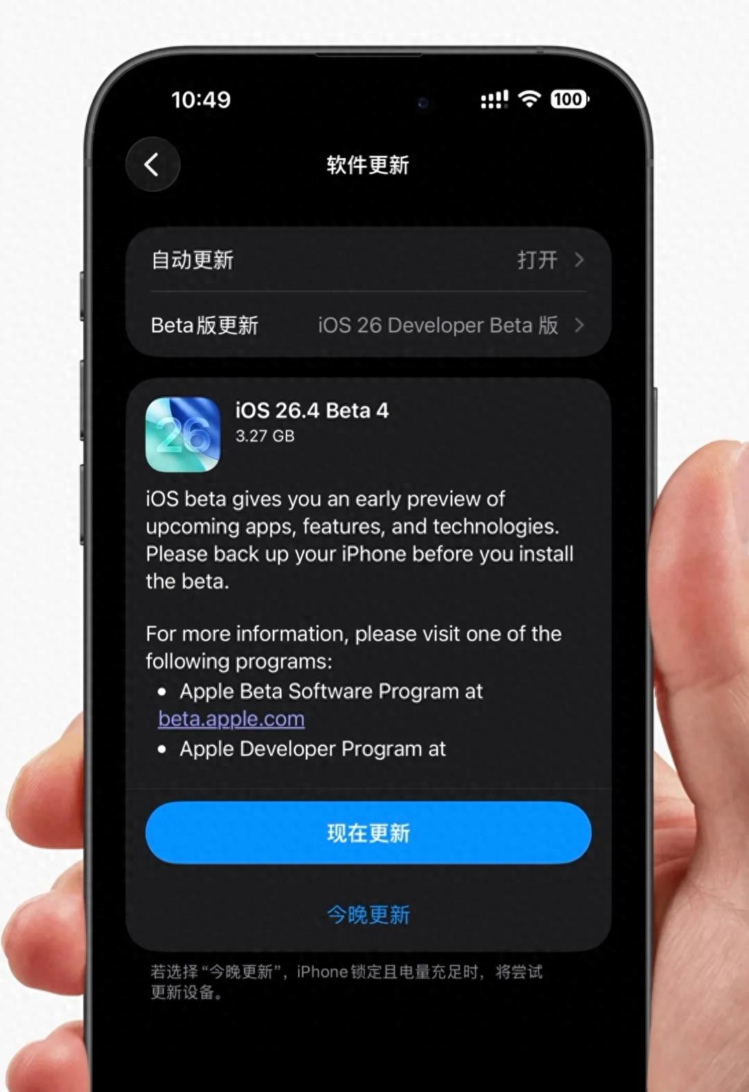历经一周时间,苹果又迎来新版系统了,就在今天凌晨发布推送了iOS 26.4 Beta 4版本更新!这次的更新点依旧不多;
