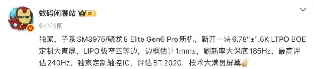 今天,博主@数码闲聊站 的一份消息显示,“独家,子系SM8975/骁龙8 Elite Gen6 Pro新机,新开一块6.78"±1.5K LTPO BOE定制大直屏,LIPO极窄四等边,边框估计1mm±,刷新率大保底185Hz,最高评估240Hz,独家定制触控IC,评估BT.2020,技术大满贯屏幕”。