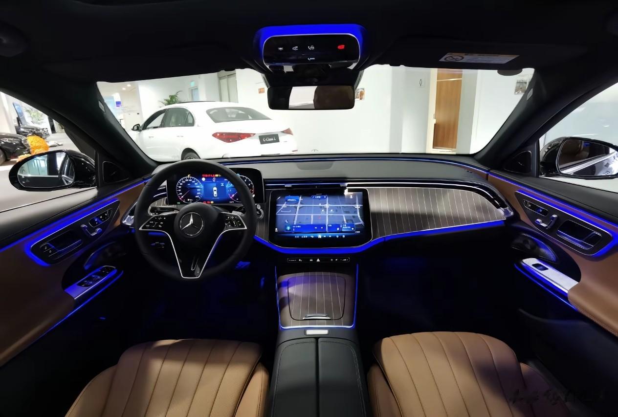 拉开车门的那一刻,两款车呈现出完全不同的世界。奔驰E300L依然保持着它标志性的豪华感,夜间64色氛围灯点亮时,车厢如同移动的艺术展厅。