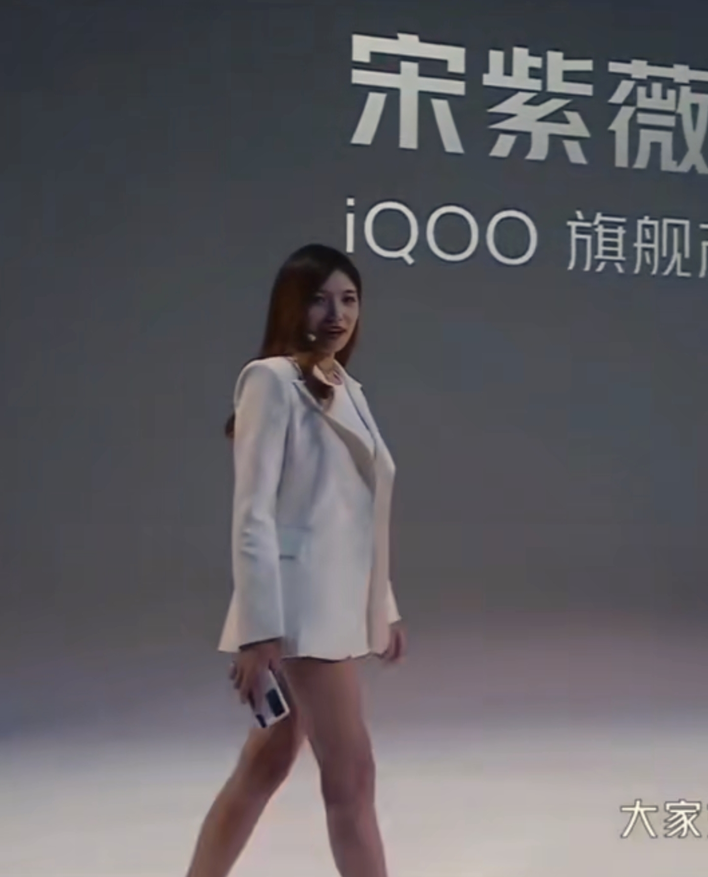 真正让宋紫薇火出圈的是2021年iQOO 7的发布会,她身穿白色西装上衣搭配白色超短裙和白色高跟鞋,上演“下衣失踪”造型。这种极度吸睛的装扮与传统严肃的科技发布会形成了巨大反差。