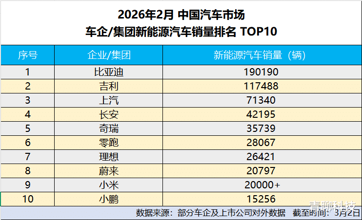 2026年开局,中国新能源汽车市场竞争格局进一步明朗。根据车企及上市公司对外披露的数据,比亚迪集团2月新能源汽车销量达1
