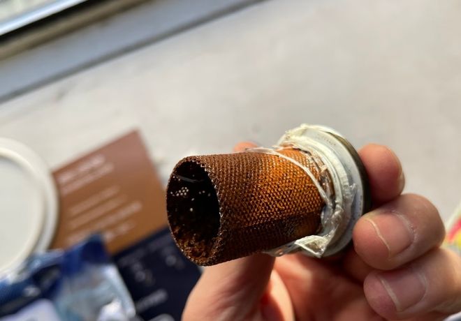 接着要关闭地暖系统的进水阀和回水阀。在滤网下面放水盆,然后用扳手逆时针拧开滤网外壳,然后取出滤网,这时就会看到一个圆柱形的金属滤网。