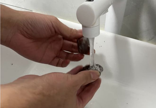 把滤网拿到自来水下冲干净,如果污渍比较多,可以用毛刷刷一下,再冲干净。