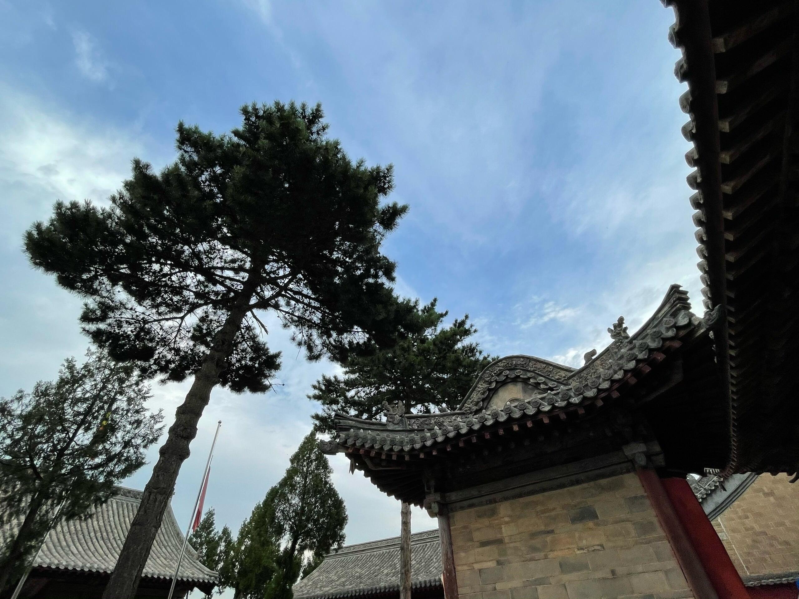 除了核心建筑,公主寺的附属空间同样充满惊喜。穿过左侧垂花门,一株参天古树直指苍穹,虬曲的枝干诉说着岁月沧桑。北面的圣母庙(老爷庙)与古戏台遥相对望,戏台始建于清康熙三十二年,木质结构历经数百年仍稳固如初。戏台飞檐斗拱间的雕刻精巧细致,藻井彩绘虽已褪色,仍能窥见当年的绚丽。这种寺庙、戏台、庙宇的组合,在山西乡间并不多见,却真实还原了古代乡村的宗教与文化生活场景。