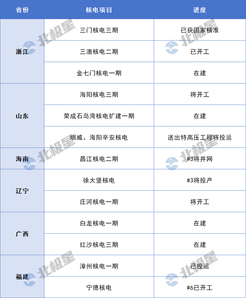 浙江、山东、广东、辽宁、广西、海南、福建等9省份在政府工作报告中提及核电,涉及三门核电、海阳核电、昌江核电、白龙核电等13个核电项目。