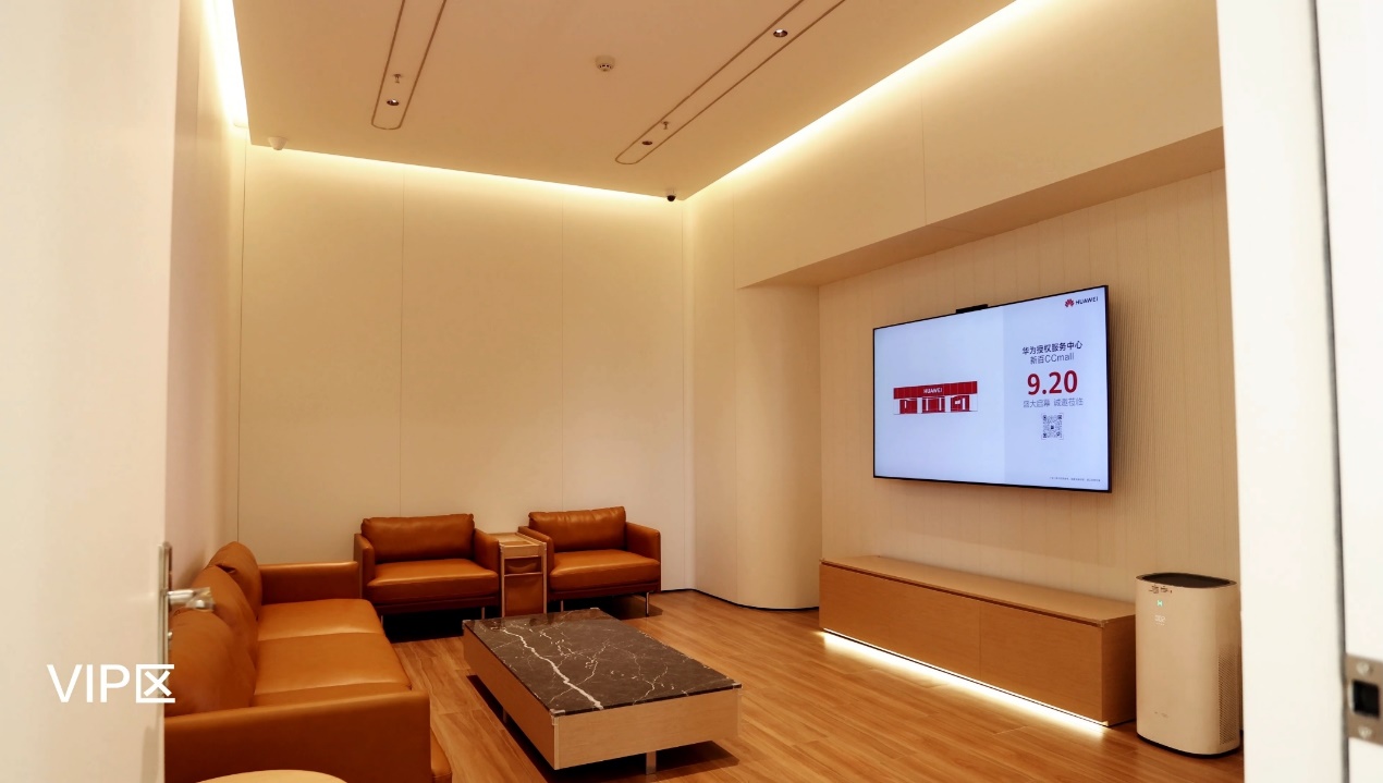 走近这家全新的授权服务中心,映入眼帘的是干净透亮的宽敞玻璃外墙,高级简约。走进VIP室,通过暖色沙发、原木色茶几电视柜、华为智慧屏的组合布置,营造出舒适惬意的居家氛围,等待维修不再“坐不住”。