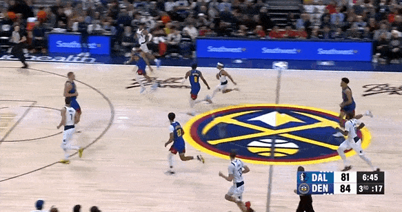 和鲍威尔发动的边路挡拆配合,挡拆行进间走Z字形遭遇琼斯刷卡的瞬间立即向前推球加速突破,从约基奇、琼斯二人之间的缝隙穿过,直杀篮下上篮得手。