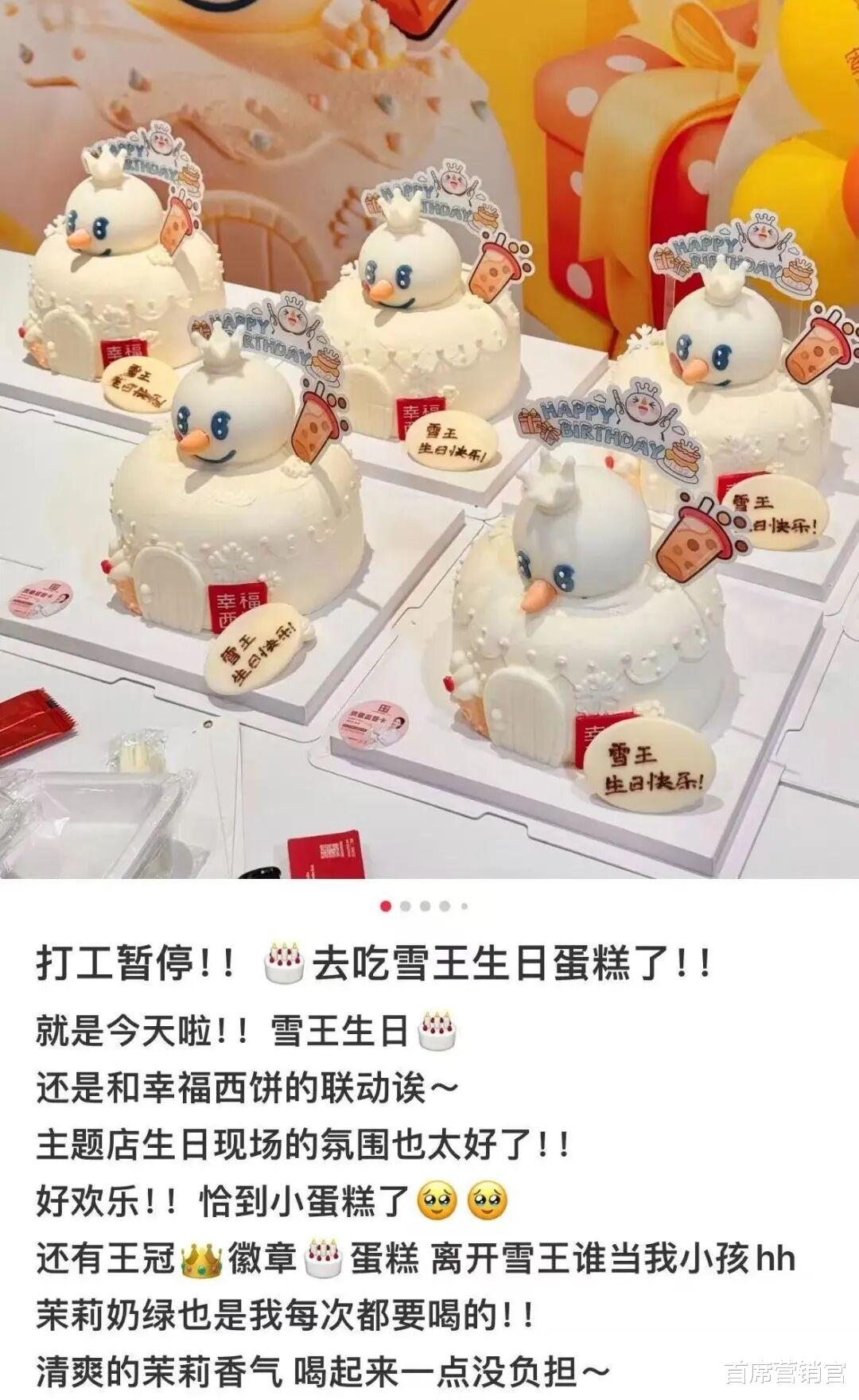 而在2024年,蜜雪冰城还和幸福西饼联名推出过一款颜值更高的生日蛋糕,几乎1:1还原了雪王的形象。