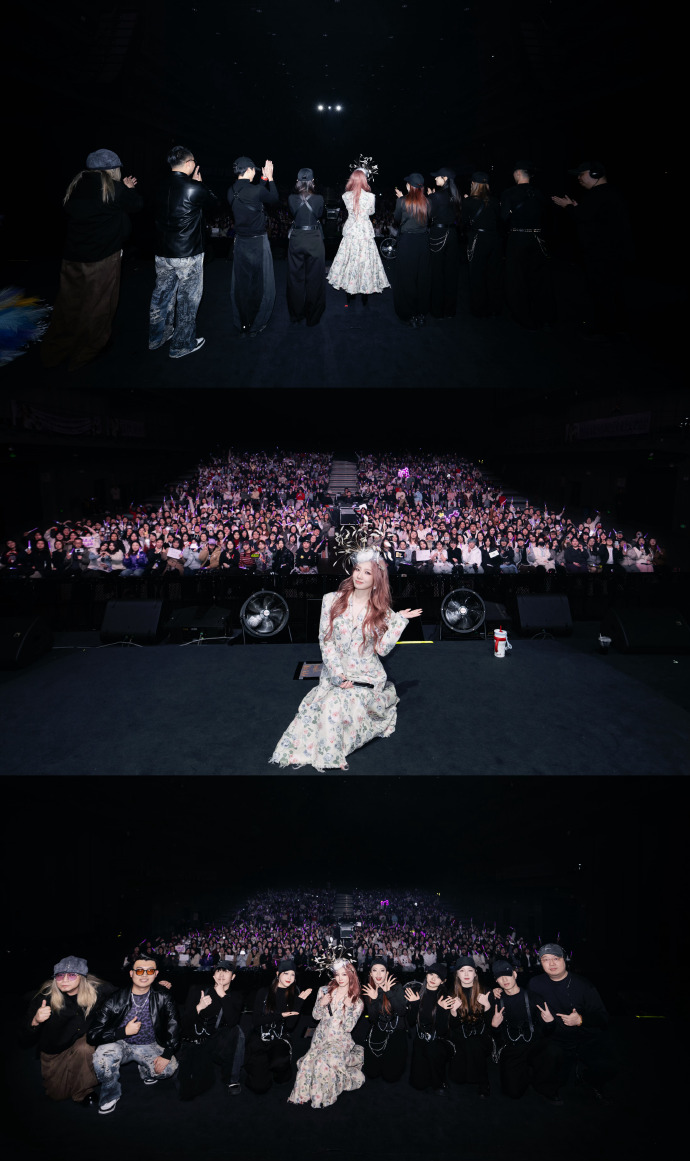 她挤在团队中间,脸上还带着舞台的妆,身边人的脸上都沾着点疲惫却开心的笑。她的巡演背后是一整个团队的配合,比如造型师要跟着她的风格换八套衣服,伴舞要和她卡上千次点。这张合照里,没人管 “舞台形象”,只有凑在一起的热乎劲儿,是她 “圆满结束” 里藏着的,一群人的用力。