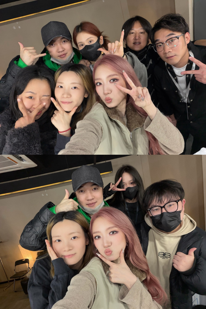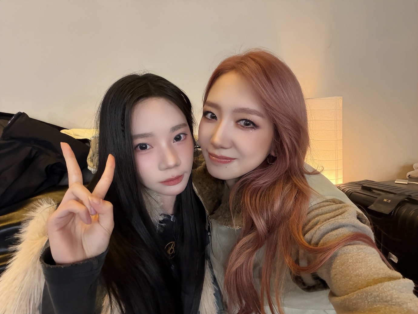 她对着镜头比出 “V” 字手,头发还带着舞台造型的卷度,旁边朋友的发梢也沾着点舞台的闪粉。舞台上的她是 “时刻在线的唱跳者”,后台的合照里,她的笑没了舞台的控制幅度,是实打实咧开的开心,连比耶的指尖都带着点没卸完的舞台劲儿,是卸下张力后的软俏。