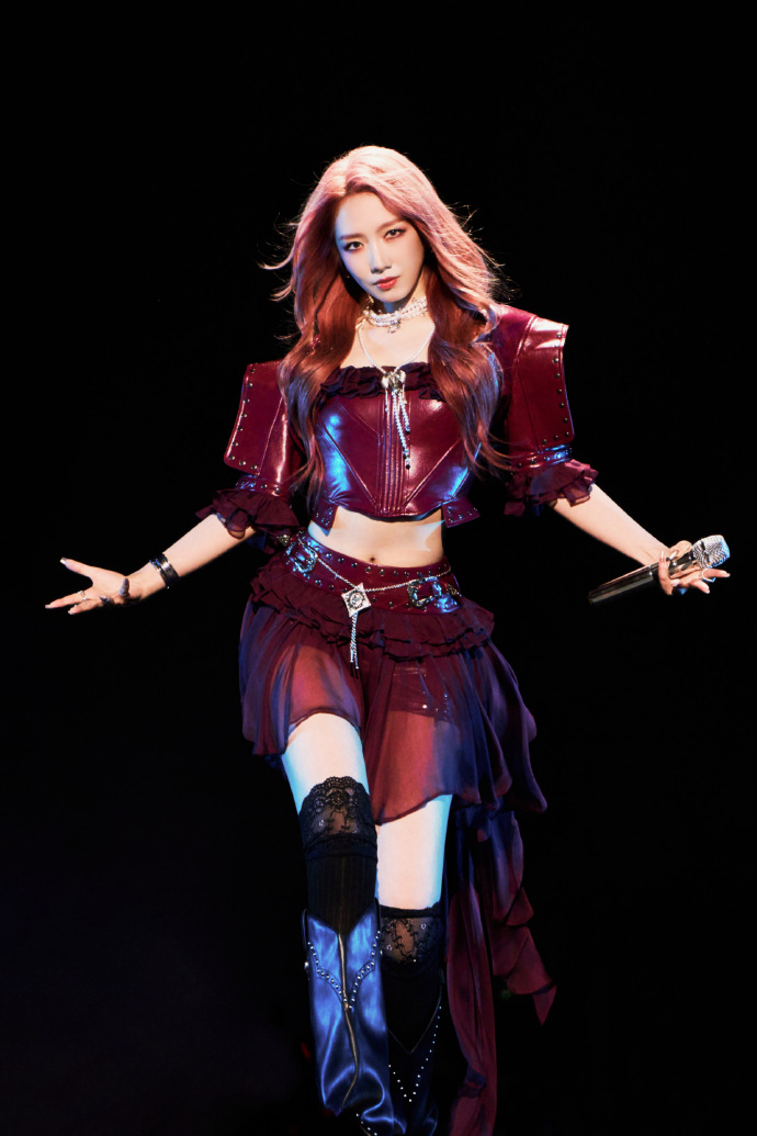 她双手握着话筒,腰链随着动作轻晃,皮质造型的细节裹得利落,眼神往观众席偏了半分。她唱跳时的持麦姿势总带着 “稳”,比如边跳边唱时,话筒不会晃出气息范围。这次成都站的互动环节,她握着话筒的指尖泛着浅粉,连话筒线垂落的弧度,都跟着她的动作柔了点,是把舞台的张力,掺了点和观众对视的软。
