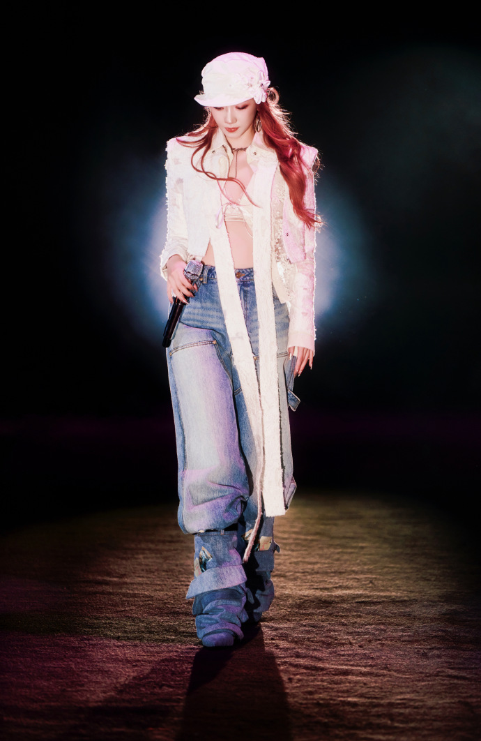 她套着宽松的白色外套,搭配阔腿牛仔裤,帽檐压在发尾,手里的话筒轻贴在身侧。之前的舞台造型多是酷飒的短款,这次的 “轻日常” 风格,刚好对应着成都站慢歌环节的松弛。她站在红调背景前,连肩线都松了点,没了快歌时的紧绷,是把舞台的 “锐”,换成了慢歌里的随性。