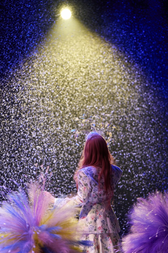 这张是背影,她穿的亮片长裙泛着细碎的彩光,裙摆随着动作铺成一片,头发染成的浅粉在光里更显柔和。她的巡演造型总爱用 “华丽衬高潮”,比如唱主打歌时,亮片裙会随着舞台灯折射出不同的光。这次成都站的高潮部分,这背影的亮片跟着她的转身晃成一片,连舞台的空气都跟着亮了起来。