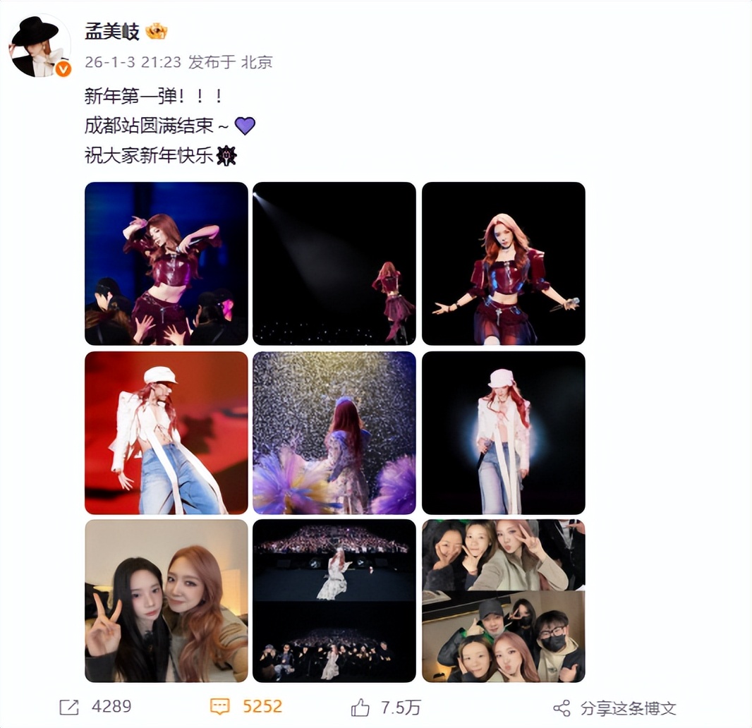 孟美岐从火箭少女 101 时期就以 “唱跳双强” 的标签站稳舞台,每一场巡演都把 “精准卡点” 和 “风格反差” 揉进造型与动作里。2026 年 1 月 3 日她在北京发布的这条动态,是成都站巡演圆满落幕后的分享。文案里的 “新年第一弹”,藏着舞台上的酷飒、亮片的华丽,还有后台卸下张力后的软。