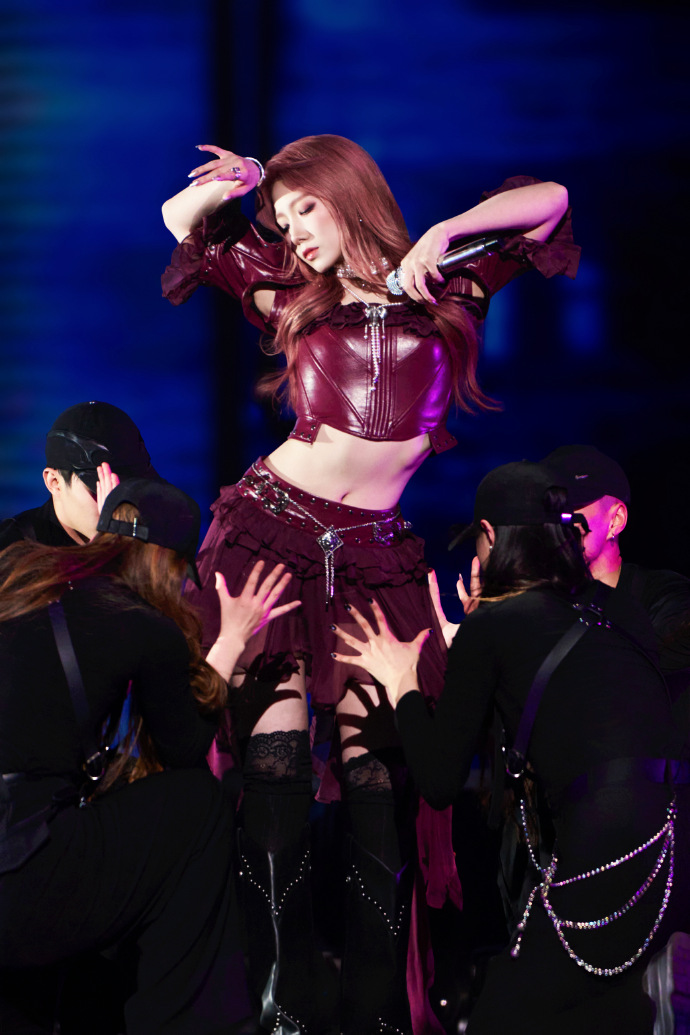 这张里,她穿的紫红外套是短款皮质设计,搭配同色系短裤,动作卡在伴舞的节奏里,手臂的舒展度刚好和团队动作对齐。她的舞台向来以 “同步率” 见长,比如跳快歌时,连指尖的角度都和伴舞严丝合缝。这次成都站的开场舞,外套的金属扣随着动作轻晃,连发丝甩动的弧度都踩在节拍上,是她熟稔到刻在肌肉里的舞台直觉。