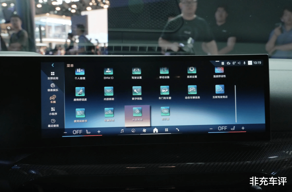 不过,宝马也学坏了啊,把空调控制也塞进了屏幕里,开车也要盲操了,别想了。就加了点氛围灯,搞点颜色变来变去,说实话,有点汽配城风,哎。