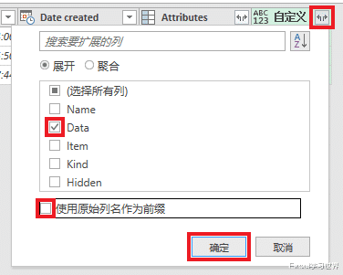 6. 展开“自定义”列 --> 仅勾选 Data --> 取消勾选“使用原始列名作为前缀”--> 点击“确定”