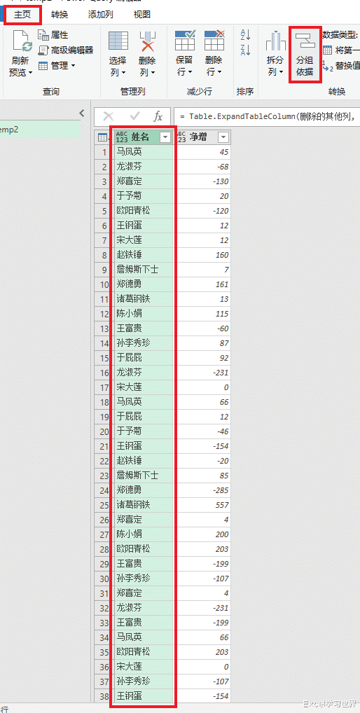 9. 选中“姓名”列 --> 选择任务栏的“主页”-->“分组依据”