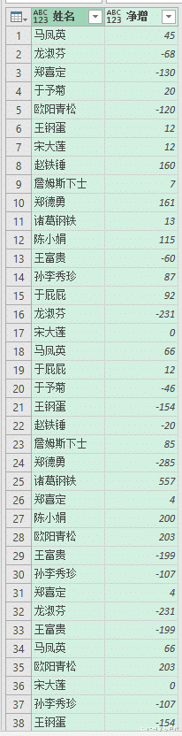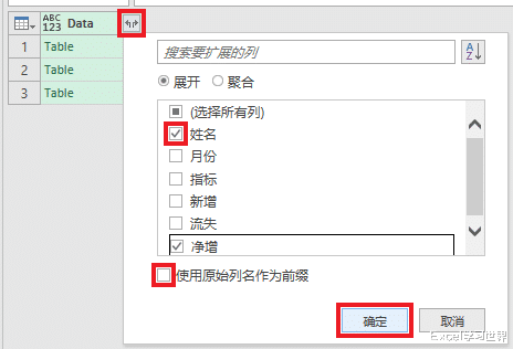 8. 展开 Data 列 --> 仅勾选“姓名”和“净增”列 --> 取消勾选“使用原始列名作为前缀”--> 点击“确定”
