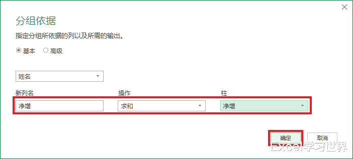 10. 在弹出的对话框中按需修改列名 --> 在“操作”中选择“求和”,“柱”中选择“净增”--> 点击“确定”