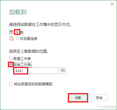 12. 在弹出的对话框中选择“表”--> 选择“现有工作表”及所需加载到的位置 --> 点击“加载”