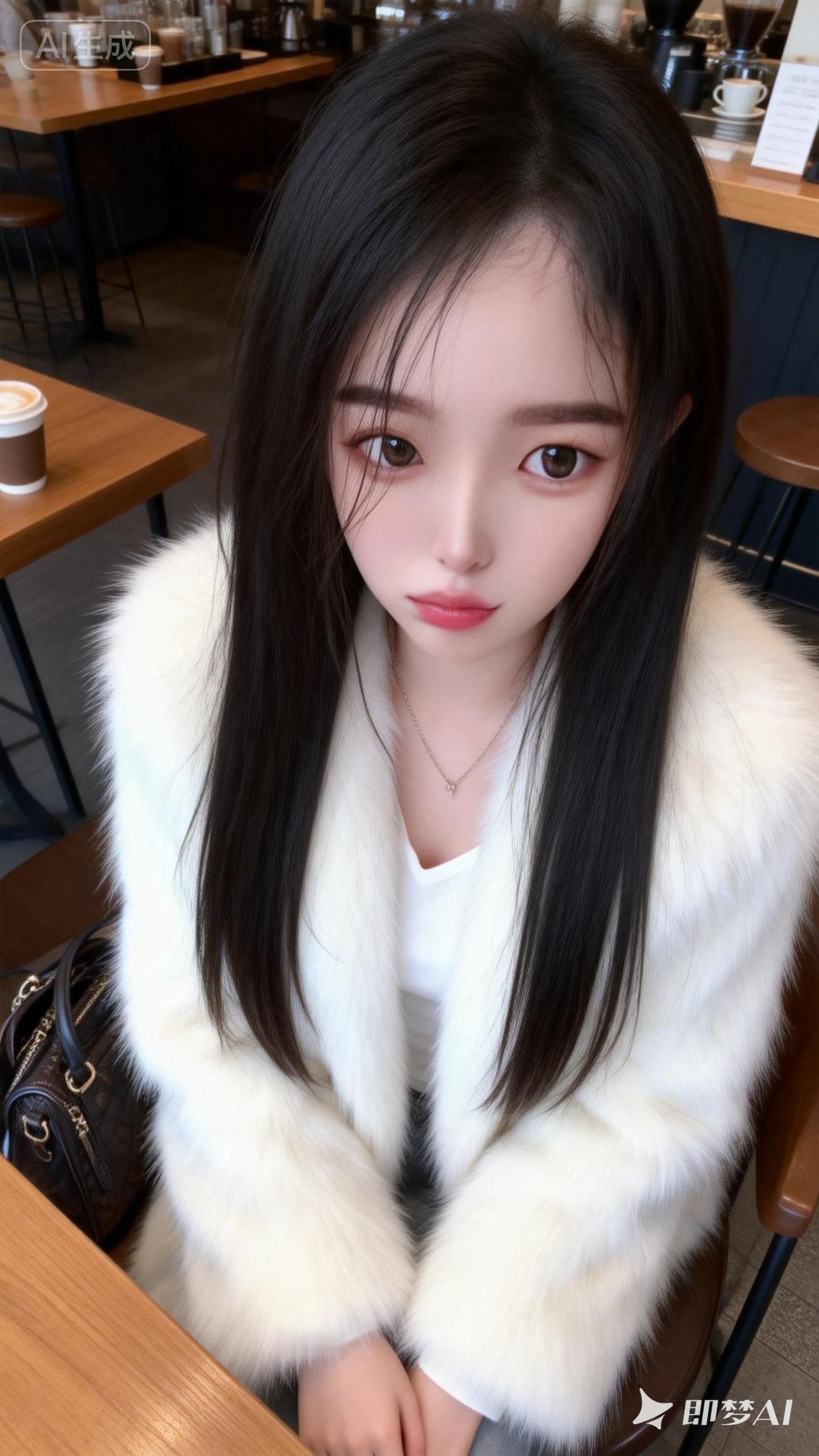 18岁美女,黑棕色大波浪长发,浓眉大眼,长睫毛,皮肤白皙,长耳坠,高档米色狐狸毛